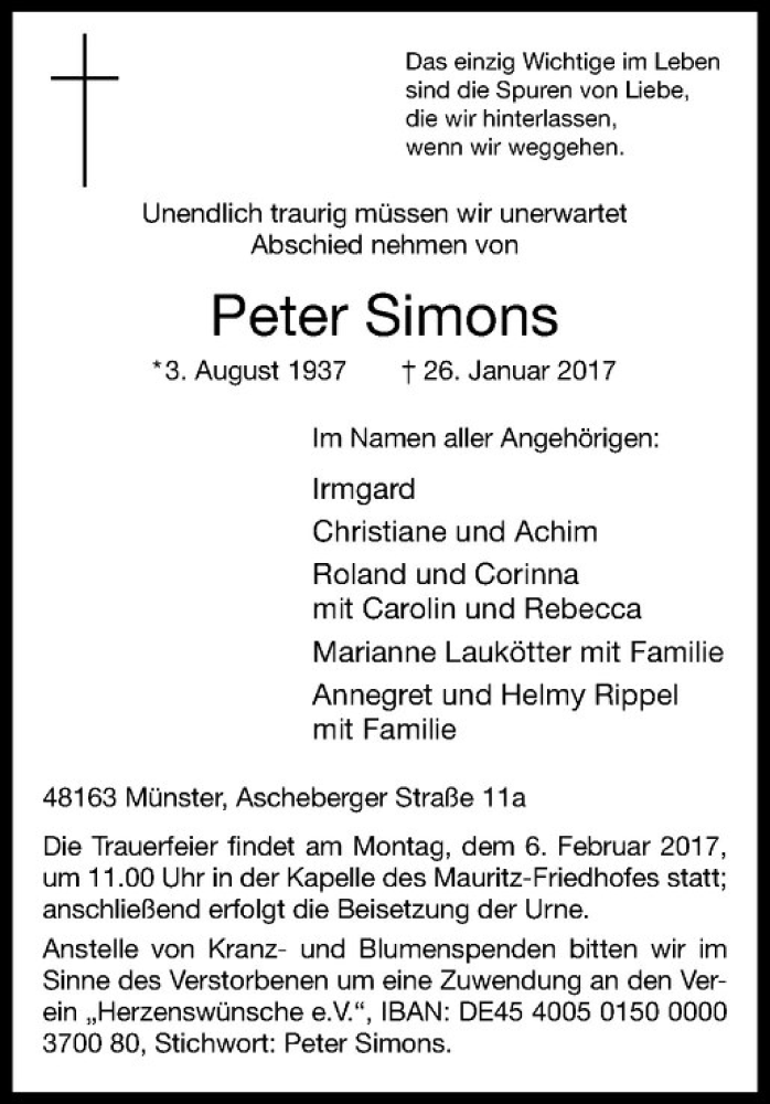 Hier finden Sie alle Traueranzeigen aus der Zeitung, die bisher für Peter Simons erschienen sind. Weitere Traueranzeigen, die in der Zeitung erscheinen, werden hier ebenfalls aufgelistet