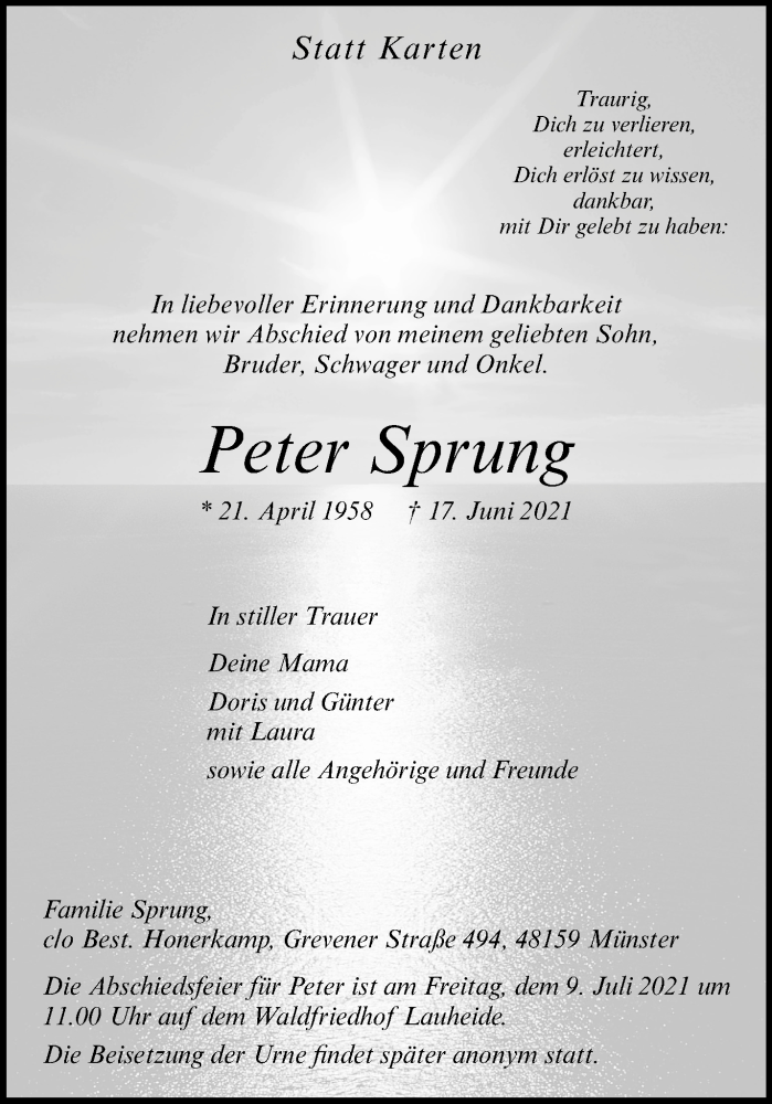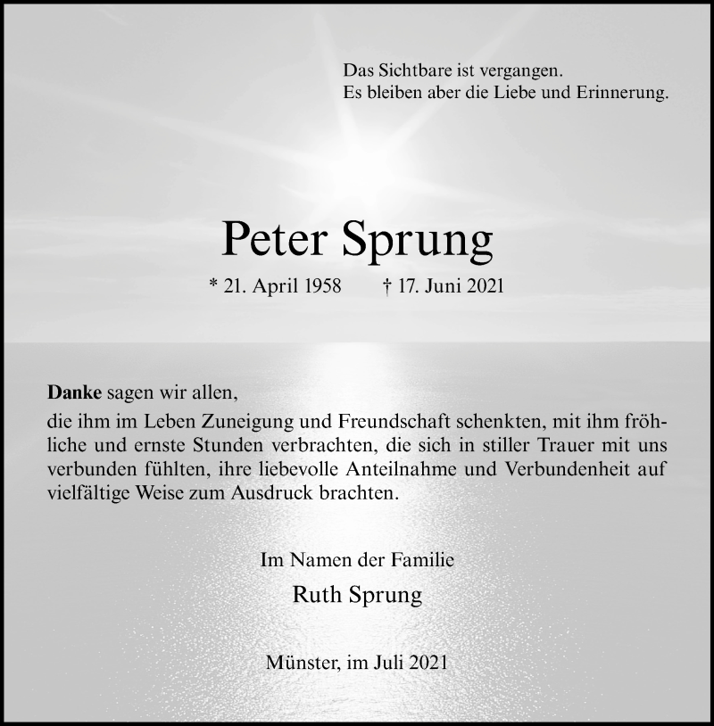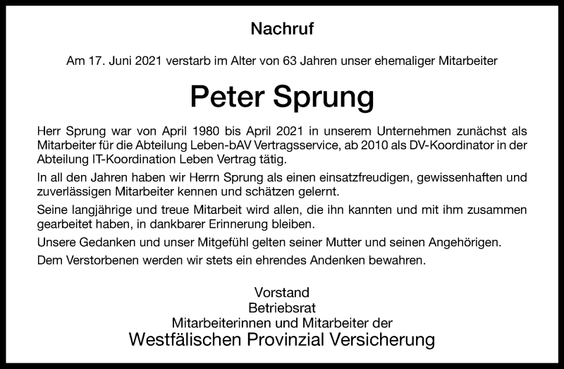 Hier finden Sie alle Traueranzeigen aus der Zeitung, die bisher für Peter Sprung erschienen sind. Weitere Traueranzeigen, die in der Zeitung erscheinen, werden hier ebenfalls aufgelistet