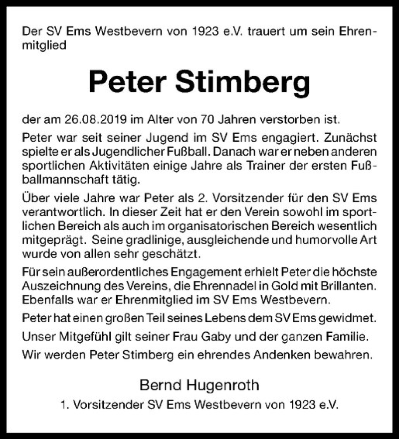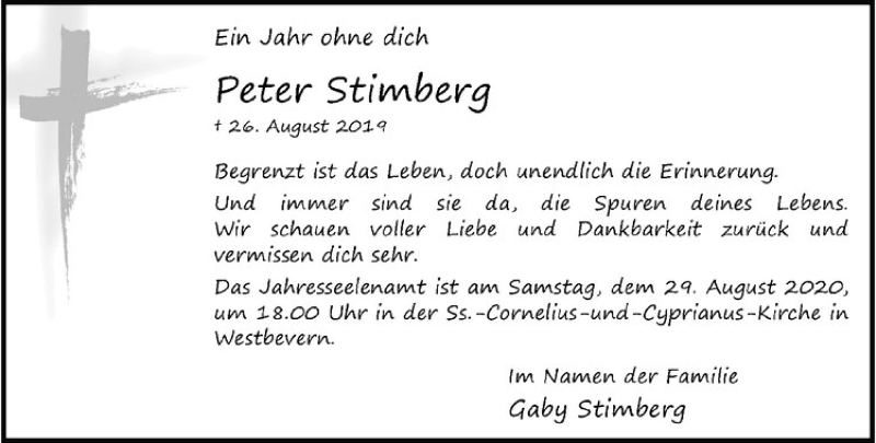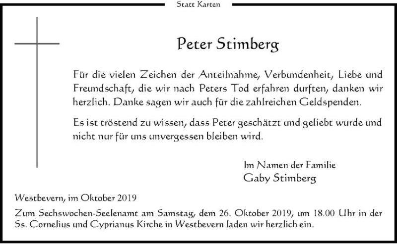Hier finden Sie alle Traueranzeigen aus der Zeitung, die bisher für Peter Stimberg erschienen sind. Weitere Traueranzeigen, die in der Zeitung erscheinen, werden hier ebenfalls aufgelistet