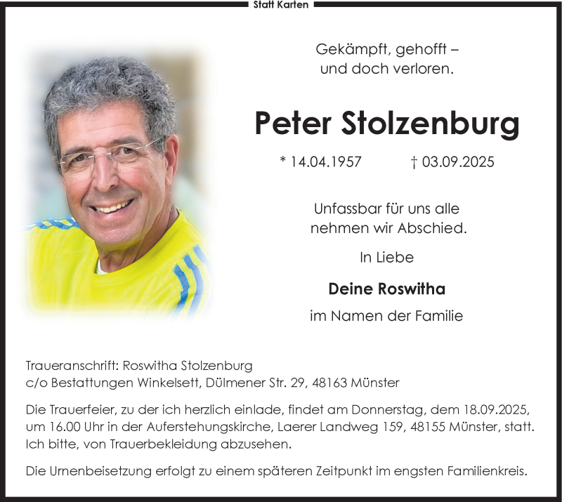 Hier finden Sie alle Traueranzeigen aus der Zeitung, die bisher für Peter Stolzenburg erschienen sind. Weitere Traueranzeigen, die in der Zeitung erscheinen, werden hier ebenfalls aufgelistet