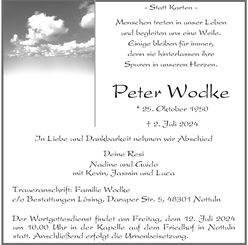 Hier finden Sie alle Traueranzeigen aus der Zeitung, die bisher für Peter Wodke erschienen sind. Weitere Traueranzeigen, die in der Zeitung erscheinen, werden hier ebenfalls aufgelistet