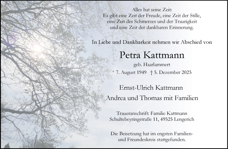 Hier finden Sie alle Traueranzeigen aus der Zeitung, die bisher für Petra Kattmann erschienen sind. Weitere Traueranzeigen, die in der Zeitung erscheinen, werden hier ebenfalls aufgelistet