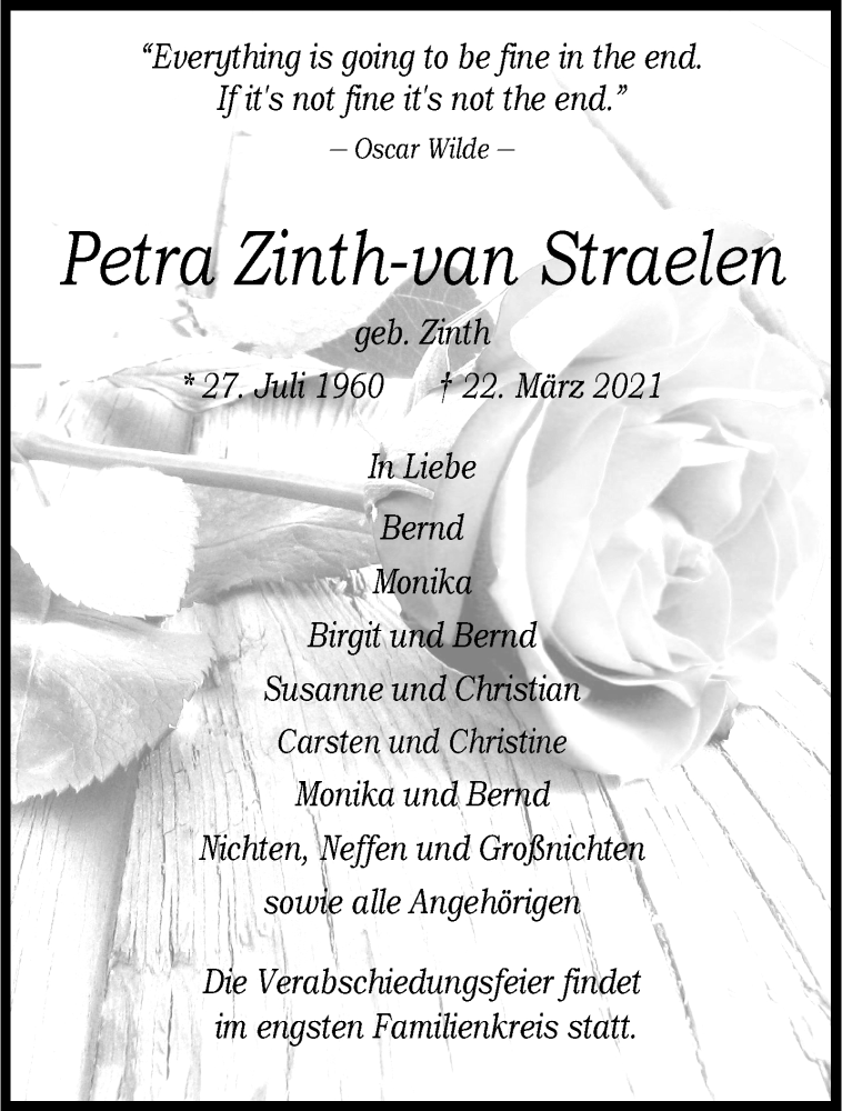 Hier finden Sie alle Traueranzeigen aus der Zeitung, die bisher für Petra Zinth-van Straelen erschienen sind. Weitere Traueranzeigen, die in der Zeitung erscheinen, werden hier ebenfalls aufgelistet
