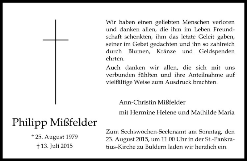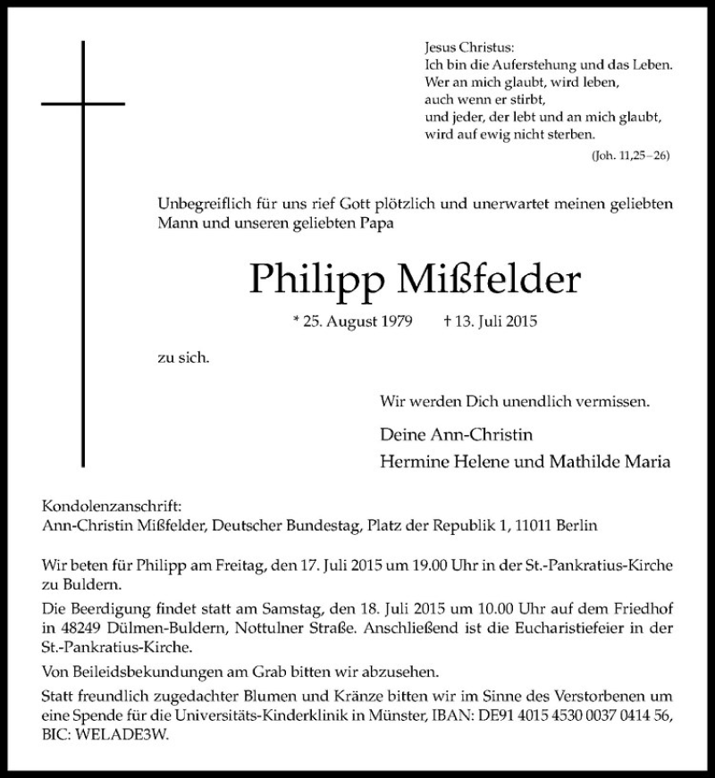 Hier finden Sie alle Traueranzeigen aus der Zeitung, die bisher für Philipp Mißfelder erschienen sind. Weitere Traueranzeigen, die in der Zeitung erscheinen, werden hier ebenfalls aufgelistet