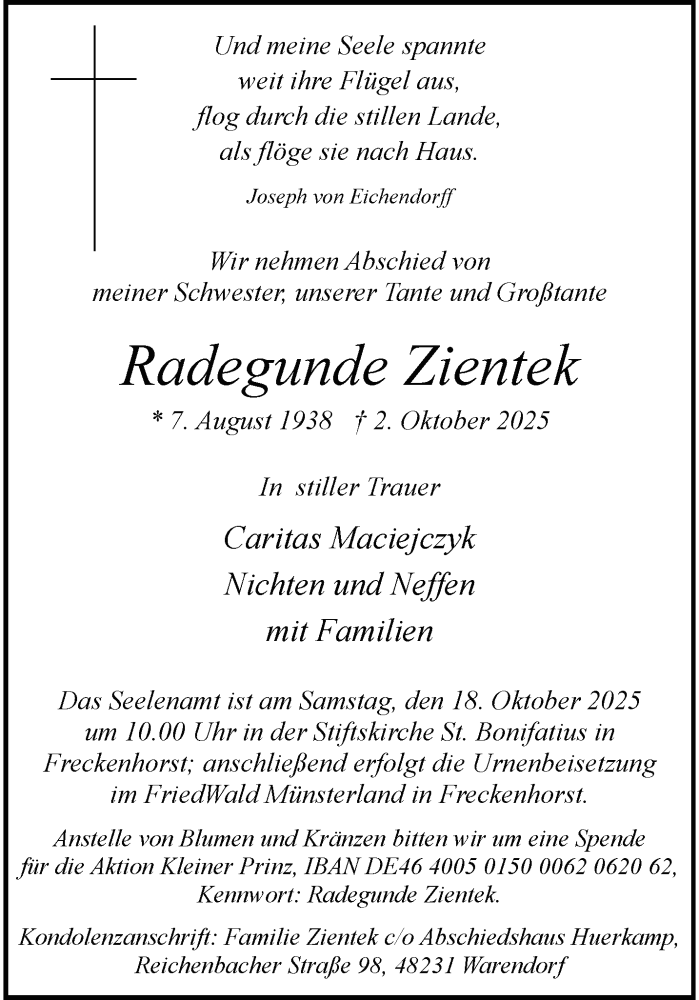 Hier finden Sie alle Traueranzeigen aus der Zeitung, die bisher für Radegunde Zientek erschienen sind. Weitere Traueranzeigen, die in der Zeitung erscheinen, werden hier ebenfalls aufgelistet