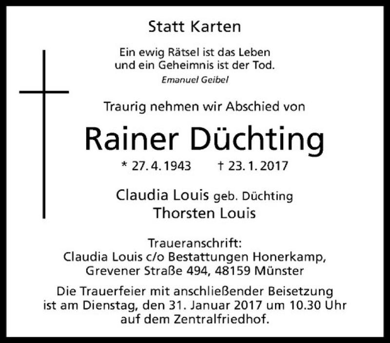 Hier finden Sie alle Traueranzeigen aus der Zeitung, die bisher für Rainer Düchting erschienen sind. Weitere Traueranzeigen, die in der Zeitung erscheinen, werden hier ebenfalls aufgelistet