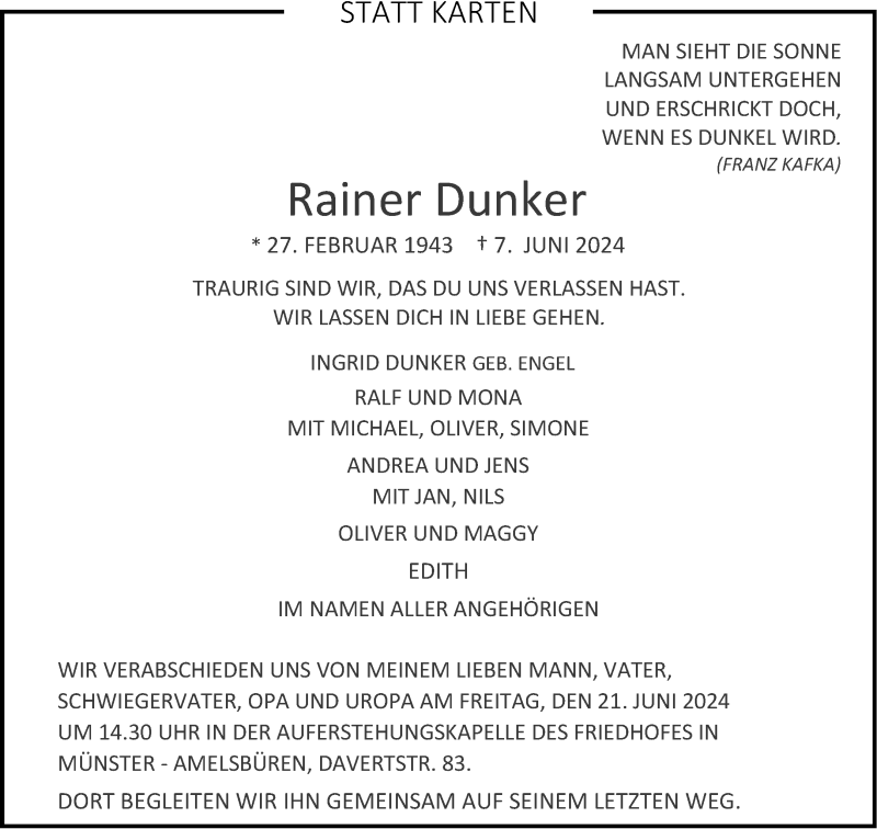 Hier finden Sie alle Traueranzeigen aus der Zeitung, die bisher für Rainer Dunker erschienen sind. Weitere Traueranzeigen, die in der Zeitung erscheinen, werden hier ebenfalls aufgelistet