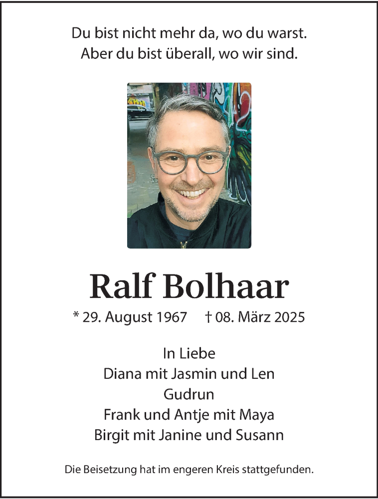 Hier finden Sie alle Traueranzeigen aus der Zeitung, die bisher für Ralf Bolhaar erschienen sind. Weitere Traueranzeigen, die in der Zeitung erscheinen, werden hier ebenfalls aufgelistet