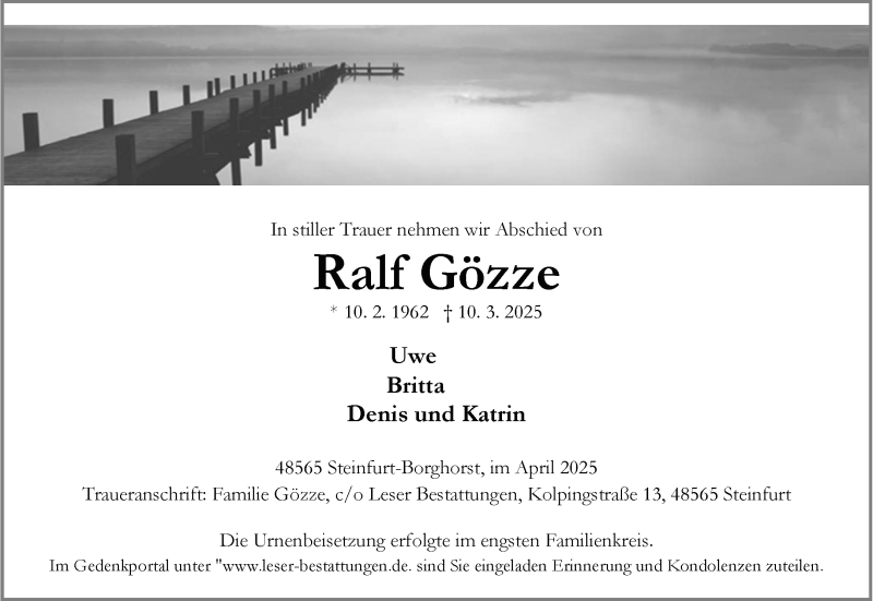 Hier finden Sie alle Traueranzeigen aus der Zeitung, die bisher für Ralf Gözze erschienen sind. Weitere Traueranzeigen, die in der Zeitung erscheinen, werden hier ebenfalls aufgelistet