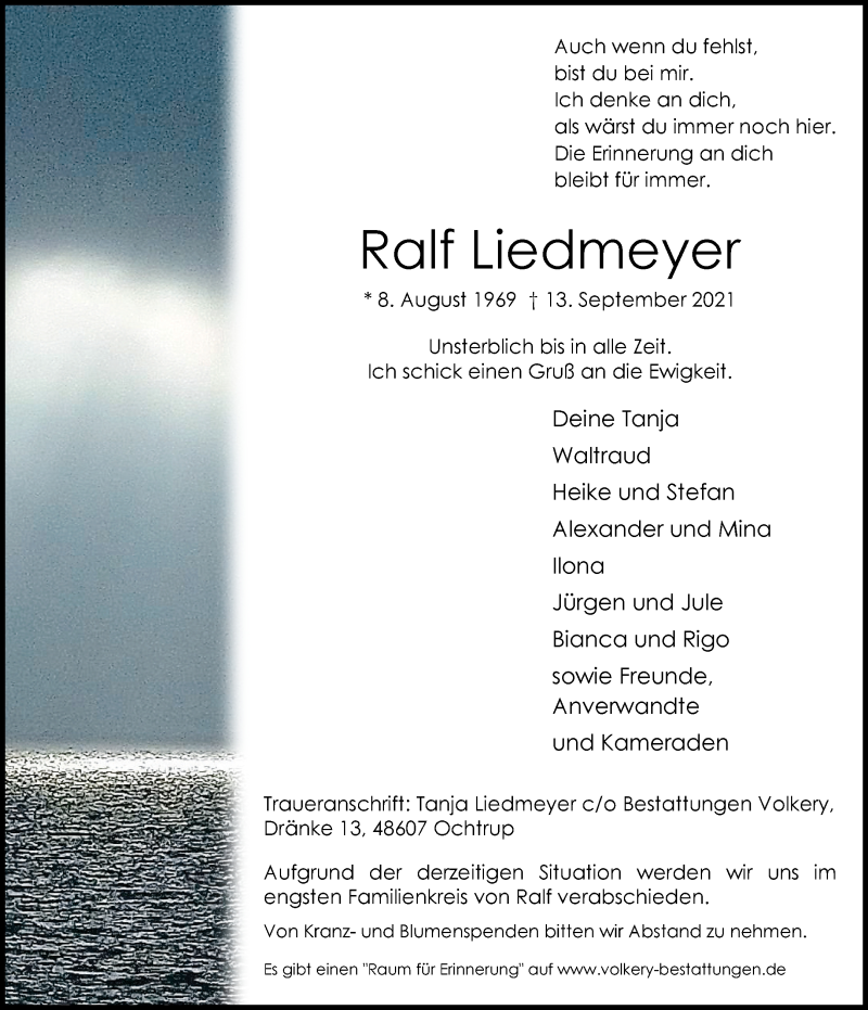 Hier finden Sie alle Traueranzeigen aus der Zeitung, die bisher für Ralf Liedmeyer erschienen sind. Weitere Traueranzeigen, die in der Zeitung erscheinen, werden hier ebenfalls aufgelistet