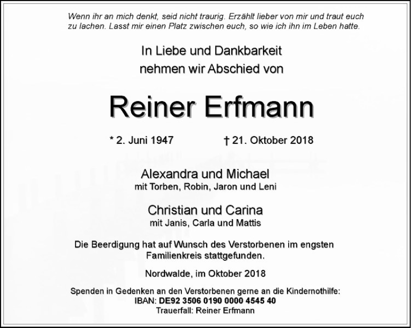 Hier finden Sie alle Traueranzeigen aus der Zeitung, die bisher für Reiner Erfmann erschienen sind. Weitere Traueranzeigen, die in der Zeitung erscheinen, werden hier ebenfalls aufgelistet