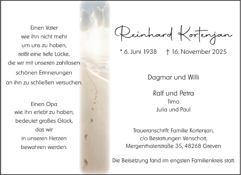 Hier finden Sie alle Traueranzeigen aus der Zeitung, die bisher für Reinhard Kortenjan erschienen sind. Weitere Traueranzeigen, die in der Zeitung erscheinen, werden hier ebenfalls aufgelistet