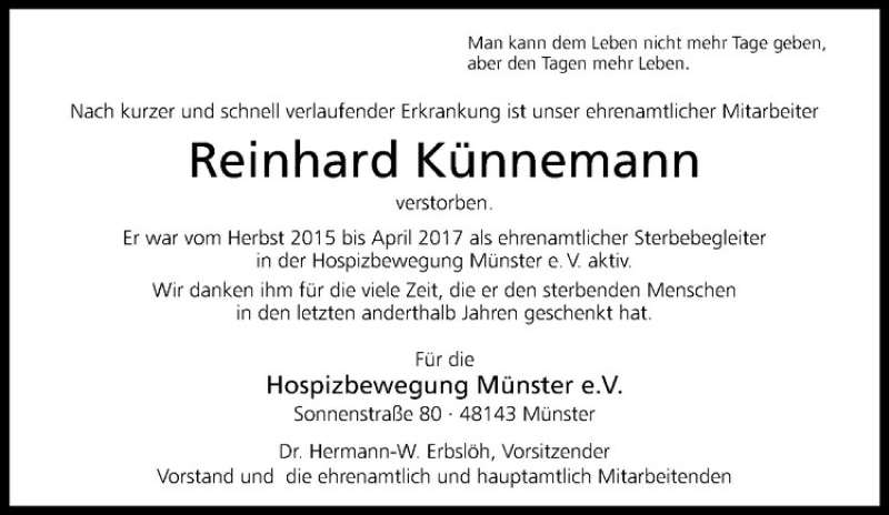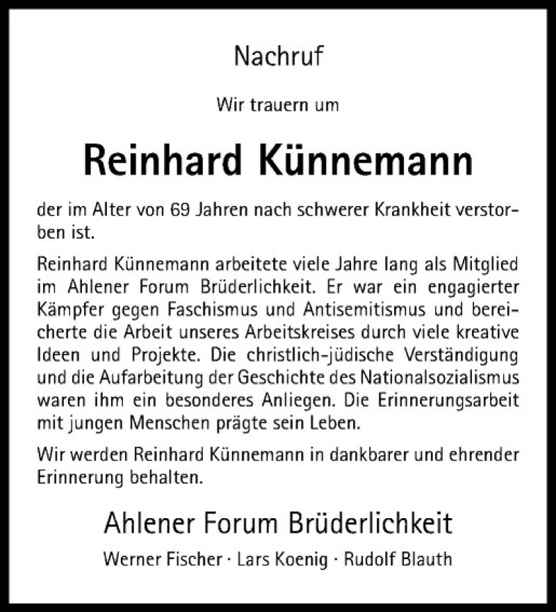 Hier finden Sie alle Traueranzeigen aus der Zeitung, die bisher für Reinhard Künnemann erschienen sind. Weitere Traueranzeigen, die in der Zeitung erscheinen, werden hier ebenfalls aufgelistet