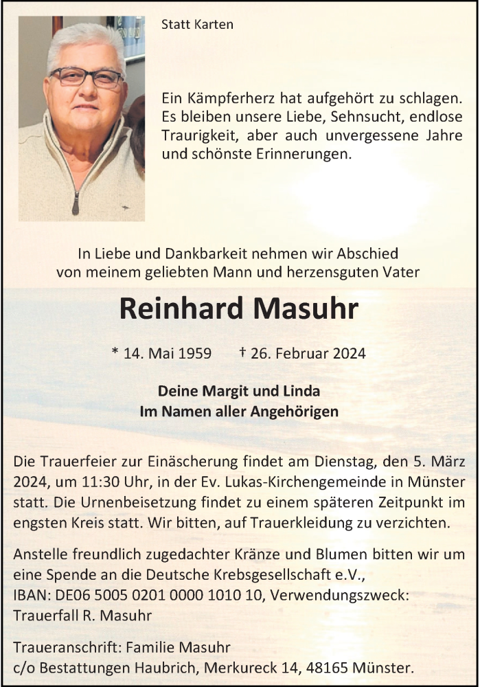 Hier finden Sie alle Traueranzeigen aus der Zeitung, die bisher für Reinhard Masuhr erschienen sind. Weitere Traueranzeigen, die in der Zeitung erscheinen, werden hier ebenfalls aufgelistet
