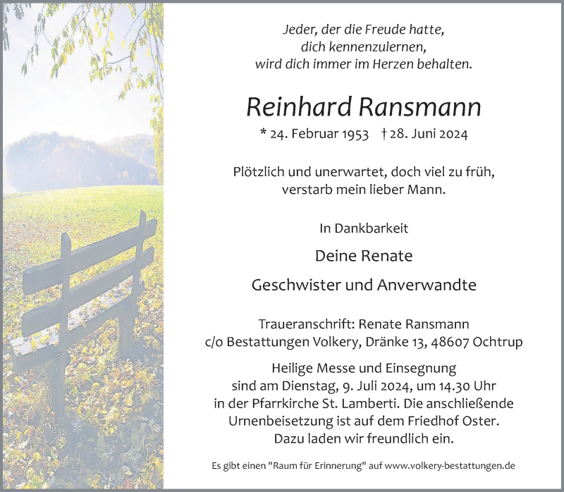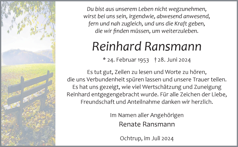 Hier finden Sie alle Traueranzeigen aus der Zeitung, die bisher für Reinhard Ransmann erschienen sind. Weitere Traueranzeigen, die in der Zeitung erscheinen, werden hier ebenfalls aufgelistet