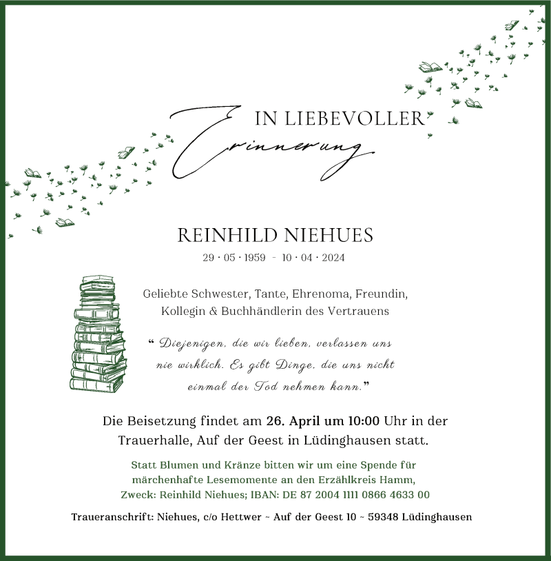 Hier finden Sie alle Traueranzeigen aus der Zeitung, die bisher für Reinhild Niehues erschienen sind. Weitere Traueranzeigen, die in der Zeitung erscheinen, werden hier ebenfalls aufgelistet