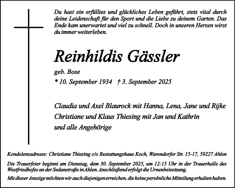 Hier finden Sie alle Traueranzeigen aus der Zeitung, die bisher für Reinhildis Gässler erschienen sind. Weitere Traueranzeigen, die in der Zeitung erscheinen, werden hier ebenfalls aufgelistet