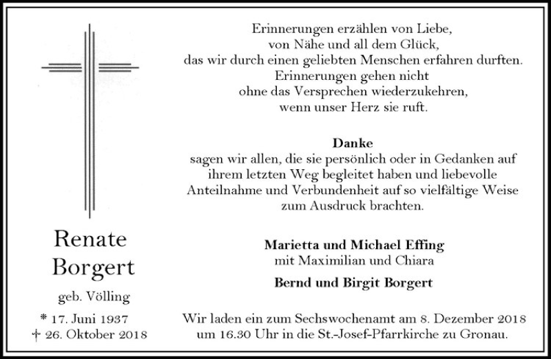 Hier finden Sie alle Traueranzeigen aus der Zeitung, die bisher für Renate Borgert erschienen sind. Weitere Traueranzeigen, die in der Zeitung erscheinen, werden hier ebenfalls aufgelistet