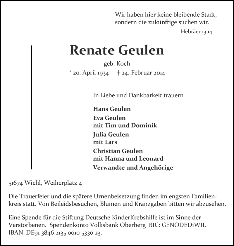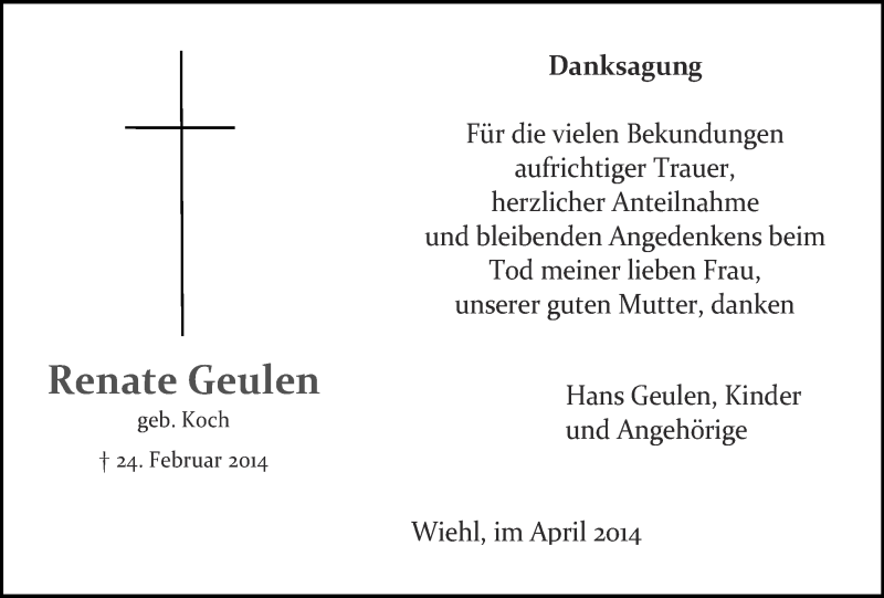Hier finden Sie alle Traueranzeigen aus der Zeitung, die bisher für Renate Geulen erschienen sind. Weitere Traueranzeigen, die in der Zeitung erscheinen, werden hier ebenfalls aufgelistet