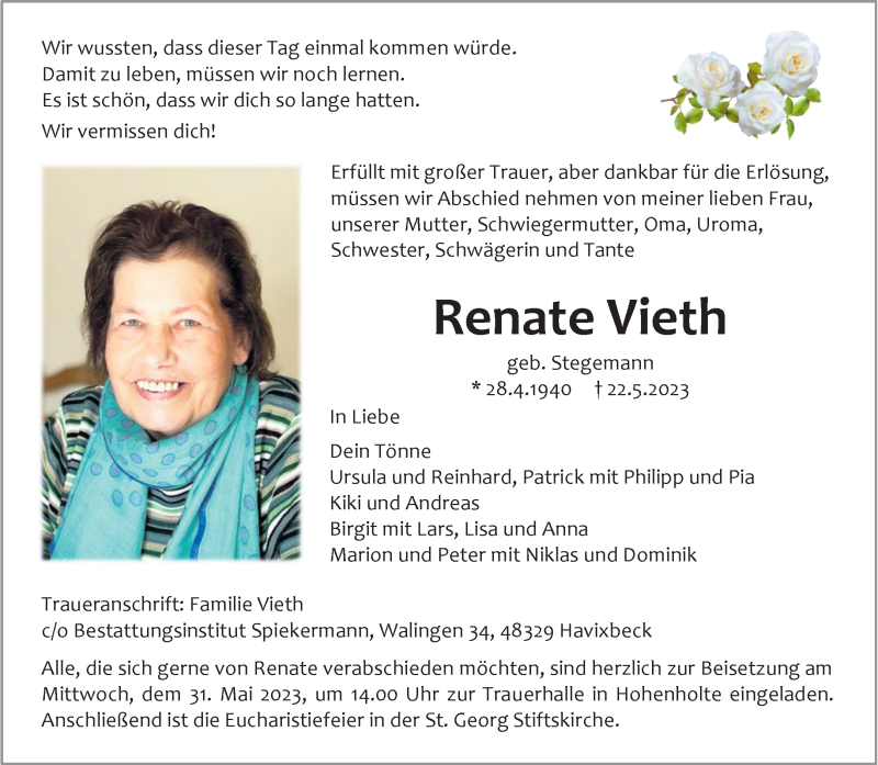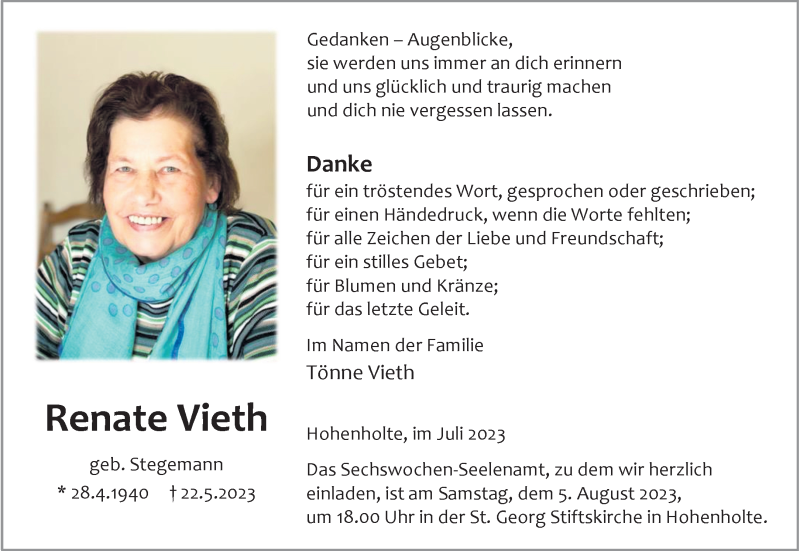 Hier finden Sie alle Traueranzeigen aus der Zeitung, die bisher für Renate Vieth erschienen sind. Weitere Traueranzeigen, die in der Zeitung erscheinen, werden hier ebenfalls aufgelistet