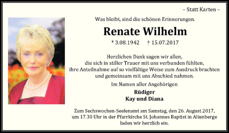Hier finden Sie alle Traueranzeigen aus der Zeitung, die bisher für Renate Wilhelm erschienen sind. Weitere Traueranzeigen, die in der Zeitung erscheinen, werden hier ebenfalls aufgelistet