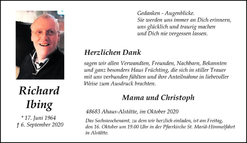 Hier finden Sie alle Traueranzeigen aus der Zeitung, die bisher für Richard Ibing erschienen sind. Weitere Traueranzeigen, die in der Zeitung erscheinen, werden hier ebenfalls aufgelistet