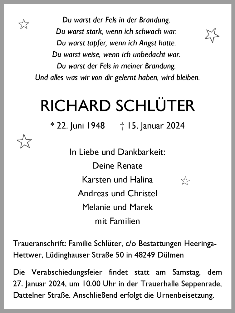 Hier finden Sie alle Traueranzeigen aus der Zeitung, die bisher für Richard Schlüter erschienen sind. Weitere Traueranzeigen, die in der Zeitung erscheinen, werden hier ebenfalls aufgelistet