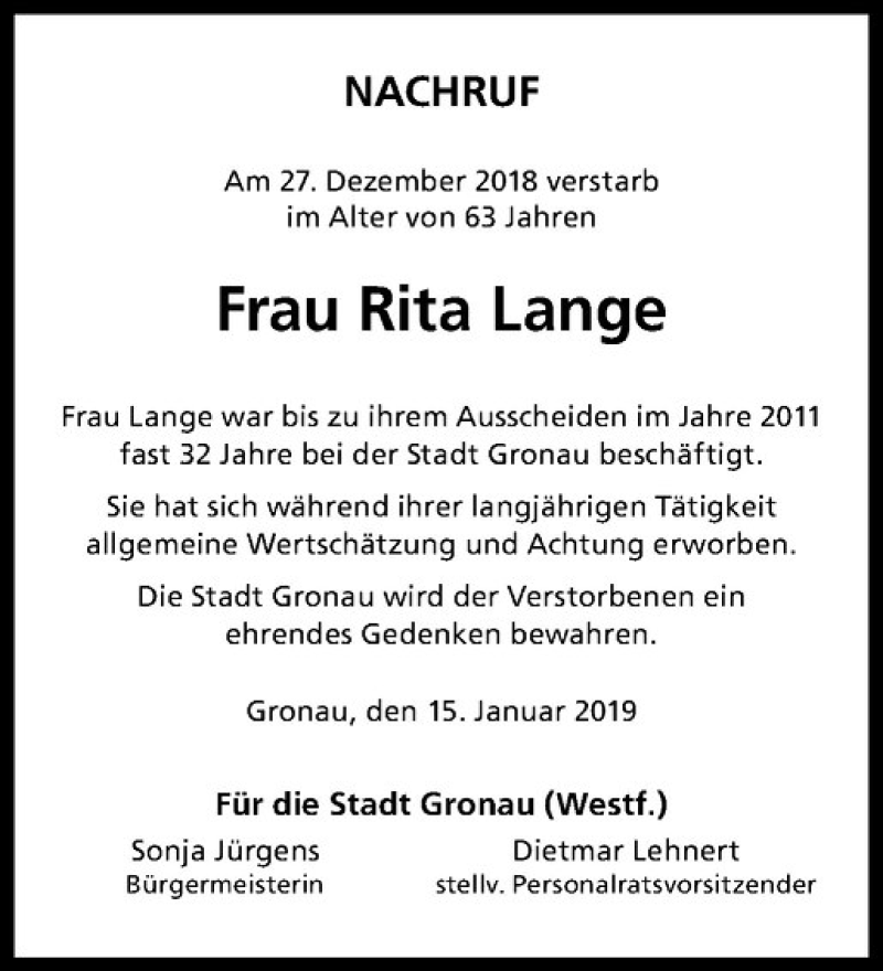 Hier finden Sie alle Traueranzeigen aus der Zeitung, die bisher für Rita Lange erschienen sind. Weitere Traueranzeigen, die in der Zeitung erscheinen, werden hier ebenfalls aufgelistet
