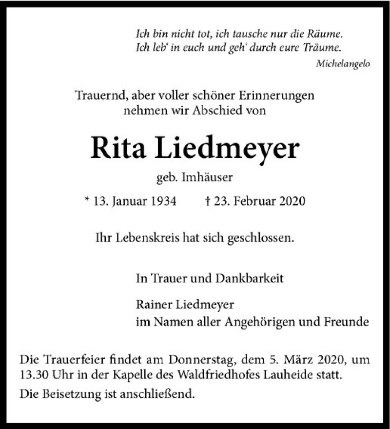 Hier finden Sie alle Traueranzeigen aus der Zeitung, die bisher für Rita Liedmeyer erschienen sind. Weitere Traueranzeigen, die in der Zeitung erscheinen, werden hier ebenfalls aufgelistet