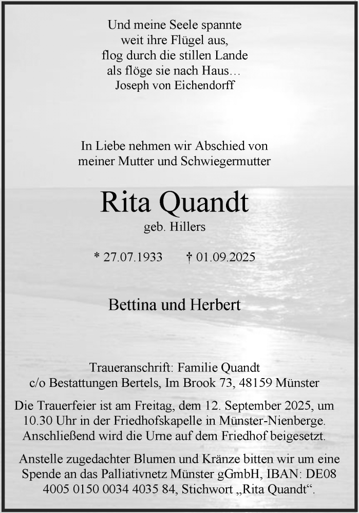 Hier finden Sie alle Traueranzeigen aus der Zeitung, die bisher für Rita Quandt erschienen sind. Weitere Traueranzeigen, die in der Zeitung erscheinen, werden hier ebenfalls aufgelistet