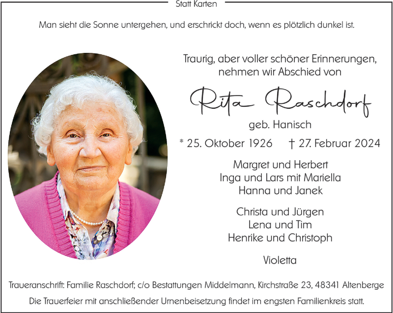 Hier finden Sie alle Traueranzeigen aus der Zeitung, die bisher für Rita Raschdorf erschienen sind. Weitere Traueranzeigen, die in der Zeitung erscheinen, werden hier ebenfalls aufgelistet