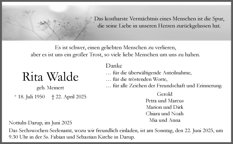 Hier finden Sie alle Traueranzeigen aus der Zeitung, die bisher für Rita Walde erschienen sind. Weitere Traueranzeigen, die in der Zeitung erscheinen, werden hier ebenfalls aufgelistet
