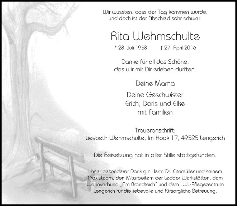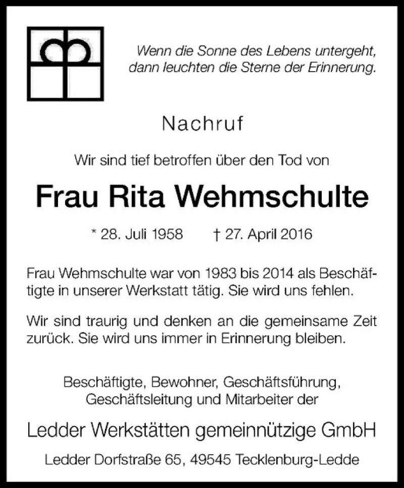 Hier finden Sie alle Traueranzeigen aus der Zeitung, die bisher für Rita Wehmschulte erschienen sind. Weitere Traueranzeigen, die in der Zeitung erscheinen, werden hier ebenfalls aufgelistet
