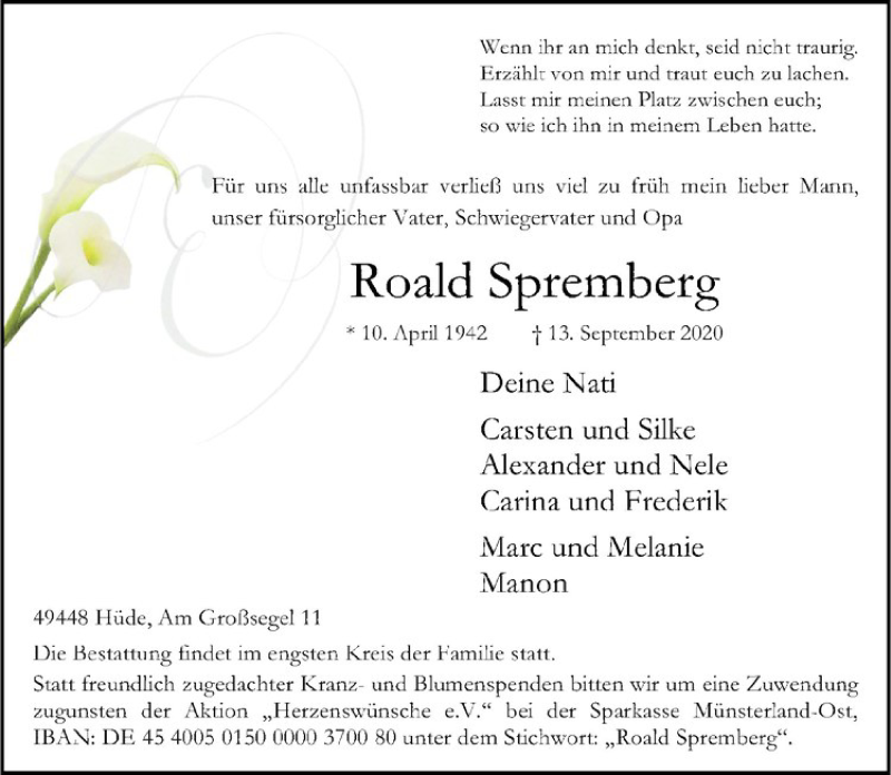 Hier finden Sie alle Traueranzeigen aus der Zeitung, die bisher für Roald Spremberg erschienen sind. Weitere Traueranzeigen, die in der Zeitung erscheinen, werden hier ebenfalls aufgelistet