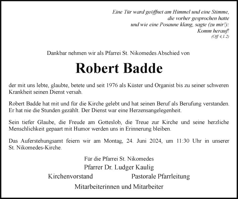 Hier finden Sie alle Traueranzeigen aus der Zeitung, die bisher für Robert Badde erschienen sind. Weitere Traueranzeigen, die in der Zeitung erscheinen, werden hier ebenfalls aufgelistet