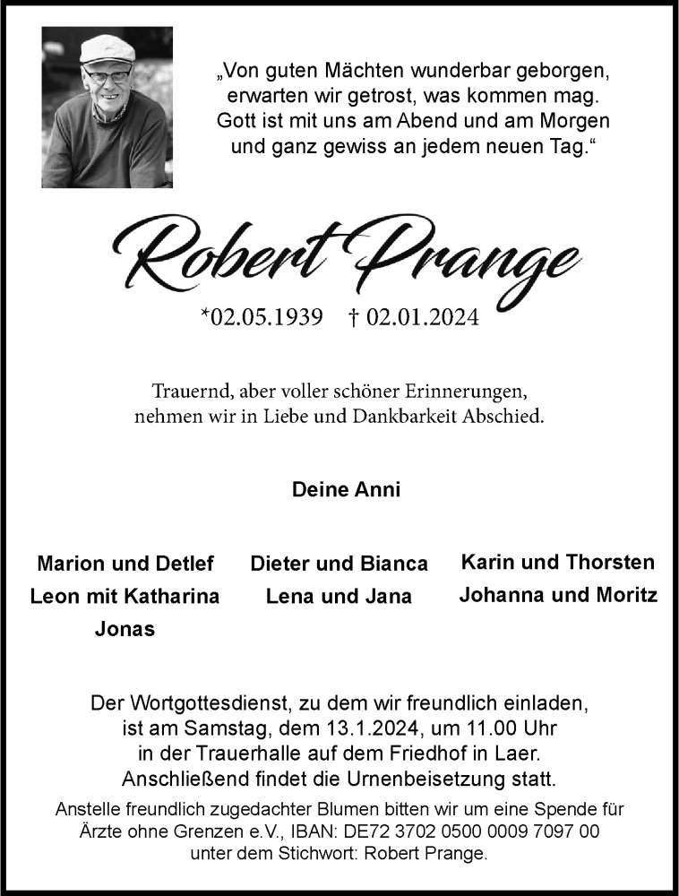 Hier finden Sie alle Traueranzeigen aus der Zeitung, die bisher für Robert Prange erschienen sind. Weitere Traueranzeigen, die in der Zeitung erscheinen, werden hier ebenfalls aufgelistet
