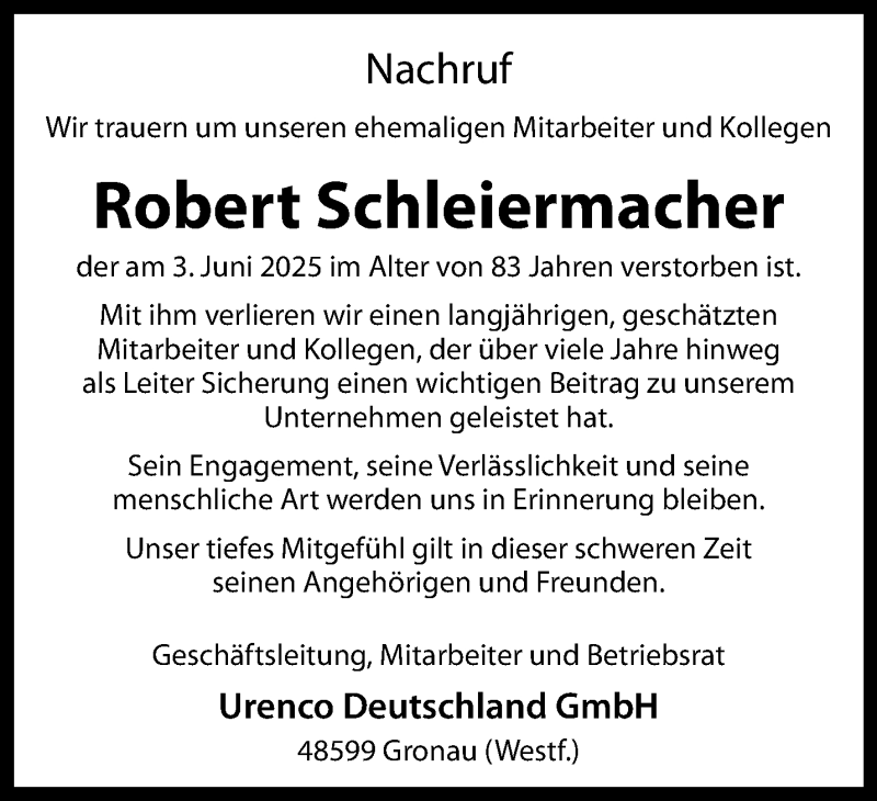 Hier finden Sie alle Traueranzeigen aus der Zeitung, die bisher für Robert Schleiermacher erschienen sind. Weitere Traueranzeigen, die in der Zeitung erscheinen, werden hier ebenfalls aufgelistet