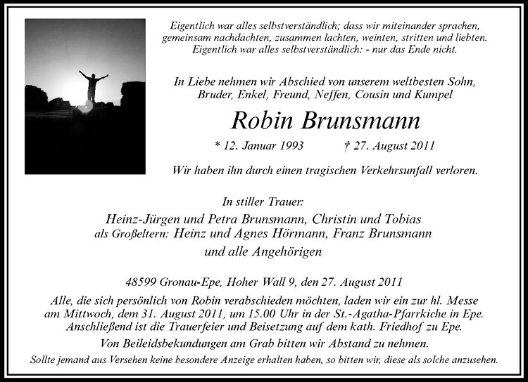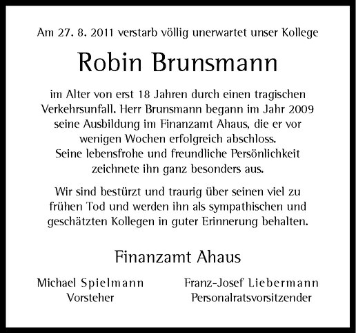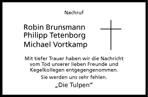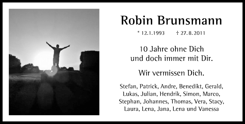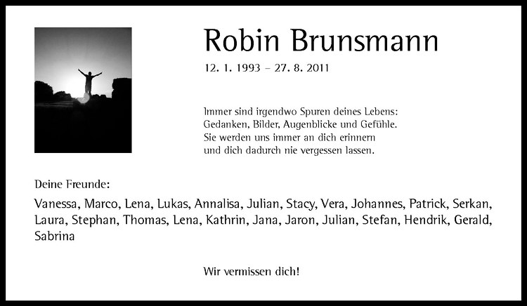 Hier finden Sie alle Traueranzeigen aus der Zeitung, die bisher für Robin Brunsmann erschienen sind. Weitere Traueranzeigen, die in der Zeitung erscheinen, werden hier ebenfalls aufgelistet