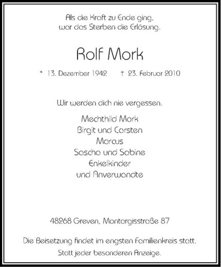 Hier finden Sie alle Traueranzeigen aus der Zeitung, die bisher für Rolf Mark erschienen sind. Weitere Traueranzeigen, die in der Zeitung erscheinen, werden hier ebenfalls aufgelistet