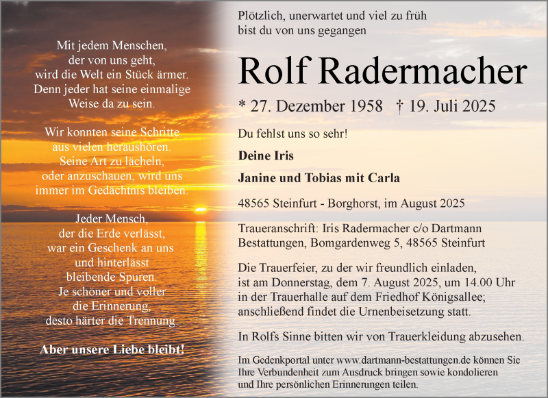 Hier finden Sie alle Traueranzeigen aus der Zeitung, die bisher für Rolf Radermacher erschienen sind. Weitere Traueranzeigen, die in der Zeitung erscheinen, werden hier ebenfalls aufgelistet