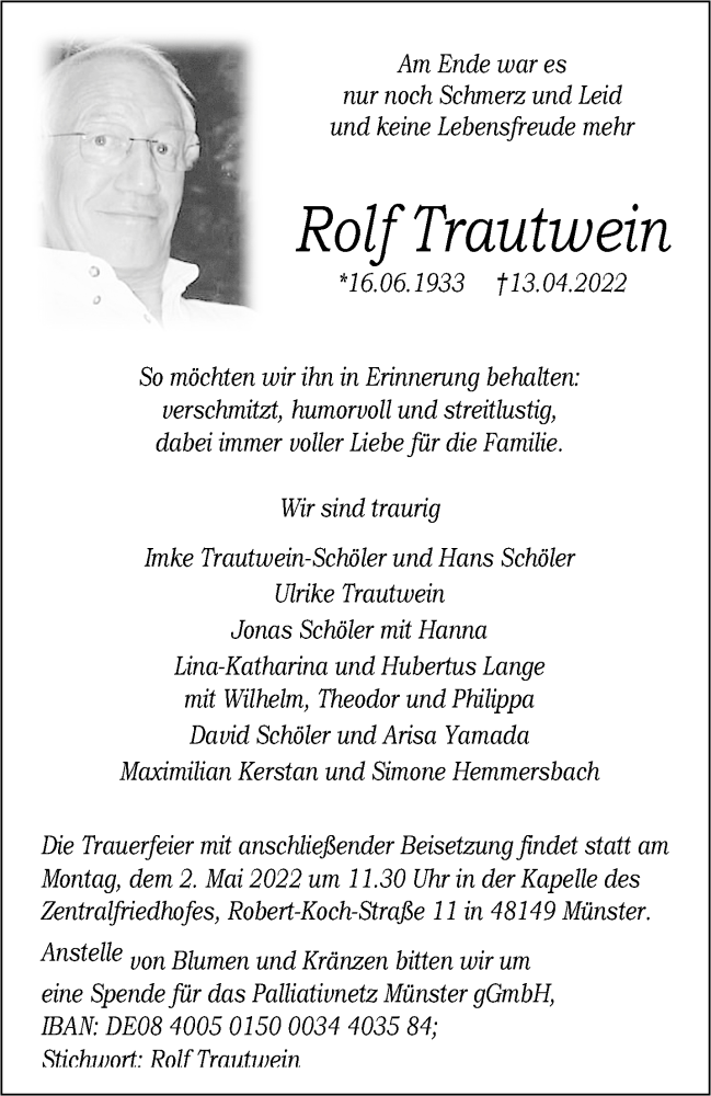 Hier finden Sie alle Traueranzeigen aus der Zeitung, die bisher für Rolf Trautwein erschienen sind. Weitere Traueranzeigen, die in der Zeitung erscheinen, werden hier ebenfalls aufgelistet