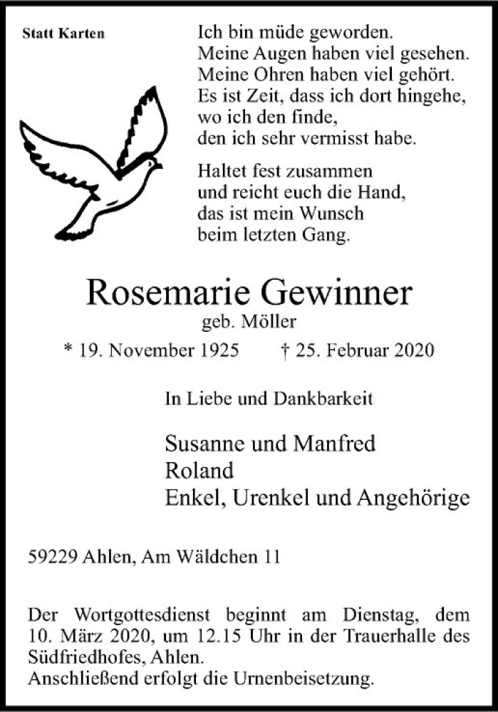 Hier finden Sie alle Traueranzeigen aus der Zeitung, die bisher für Rosemarie Gewinner erschienen sind. Weitere Traueranzeigen, die in der Zeitung erscheinen, werden hier ebenfalls aufgelistet