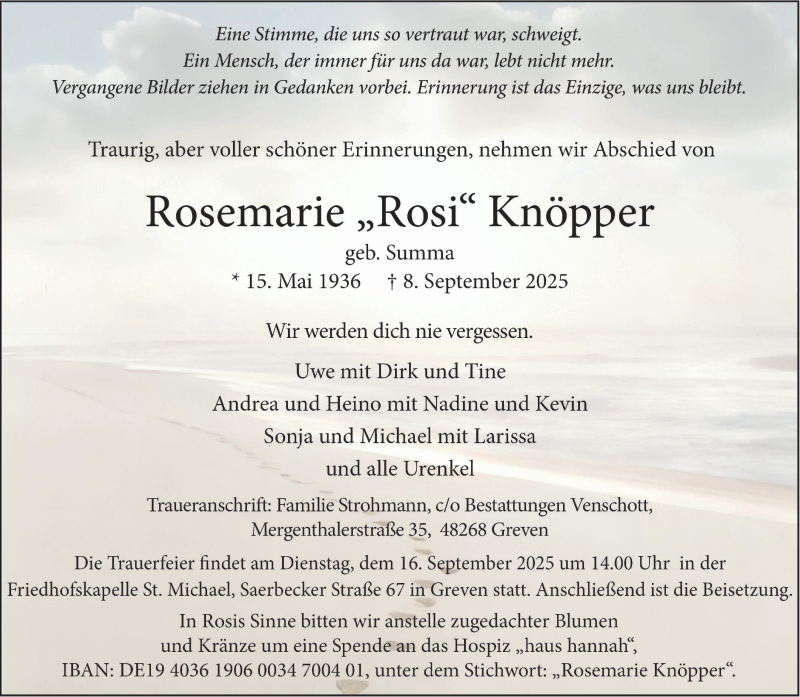 Hier finden Sie alle Traueranzeigen aus der Zeitung, die bisher für Rosemarie Knöpper erschienen sind. Weitere Traueranzeigen, die in der Zeitung erscheinen, werden hier ebenfalls aufgelistet