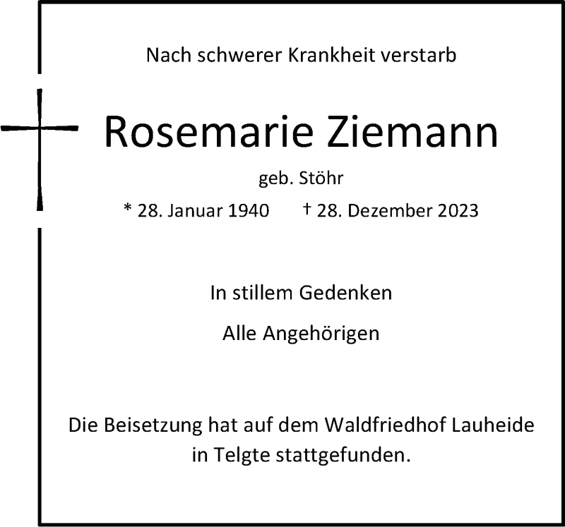 Hier finden Sie alle Traueranzeigen aus der Zeitung, die bisher für Rosemarie Ziemann erschienen sind. Weitere Traueranzeigen, die in der Zeitung erscheinen, werden hier ebenfalls aufgelistet