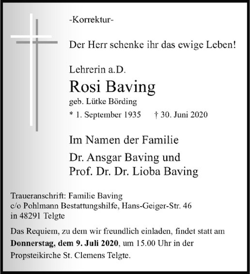 Hier finden Sie alle Traueranzeigen aus der Zeitung, die bisher für Rosi Baving erschienen sind. Weitere Traueranzeigen, die in der Zeitung erscheinen, werden hier ebenfalls aufgelistet