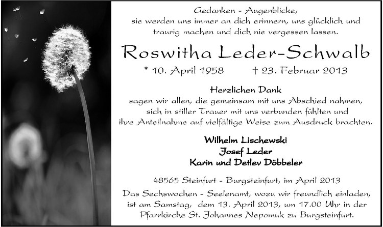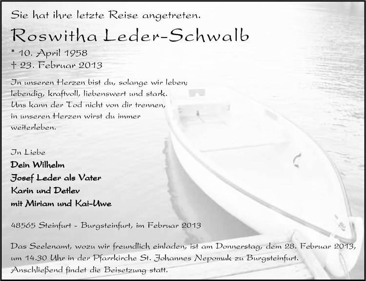 Hier finden Sie alle Traueranzeigen aus der Zeitung, die bisher für Roswitha Leder-Schwalb erschienen sind. Weitere Traueranzeigen, die in der Zeitung erscheinen, werden hier ebenfalls aufgelistet
