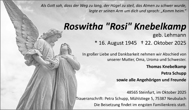 Hier finden Sie alle Traueranzeigen aus der Zeitung, die bisher für Roswitha Rosi Knebelkamp erschienen sind. Weitere Traueranzeigen, die in der Zeitung erscheinen, werden hier ebenfalls aufgelistet