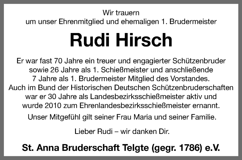 Hier finden Sie alle Traueranzeigen aus der Zeitung, die bisher für Rudi Hirsch erschienen sind. Weitere Traueranzeigen, die in der Zeitung erscheinen, werden hier ebenfalls aufgelistet