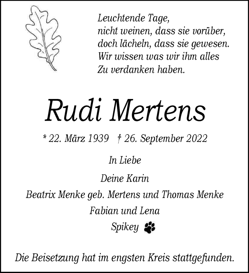 Hier finden Sie alle Traueranzeigen aus der Zeitung, die bisher für Rudi Mertens erschienen sind. Weitere Traueranzeigen, die in der Zeitung erscheinen, werden hier ebenfalls aufgelistet