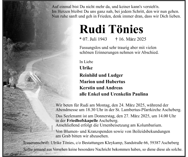 Hier finden Sie alle Traueranzeigen aus der Zeitung, die bisher für Rudi Rudi Tönies erschienen sind. Weitere Traueranzeigen, die in der Zeitung erscheinen, werden hier ebenfalls aufgelistet